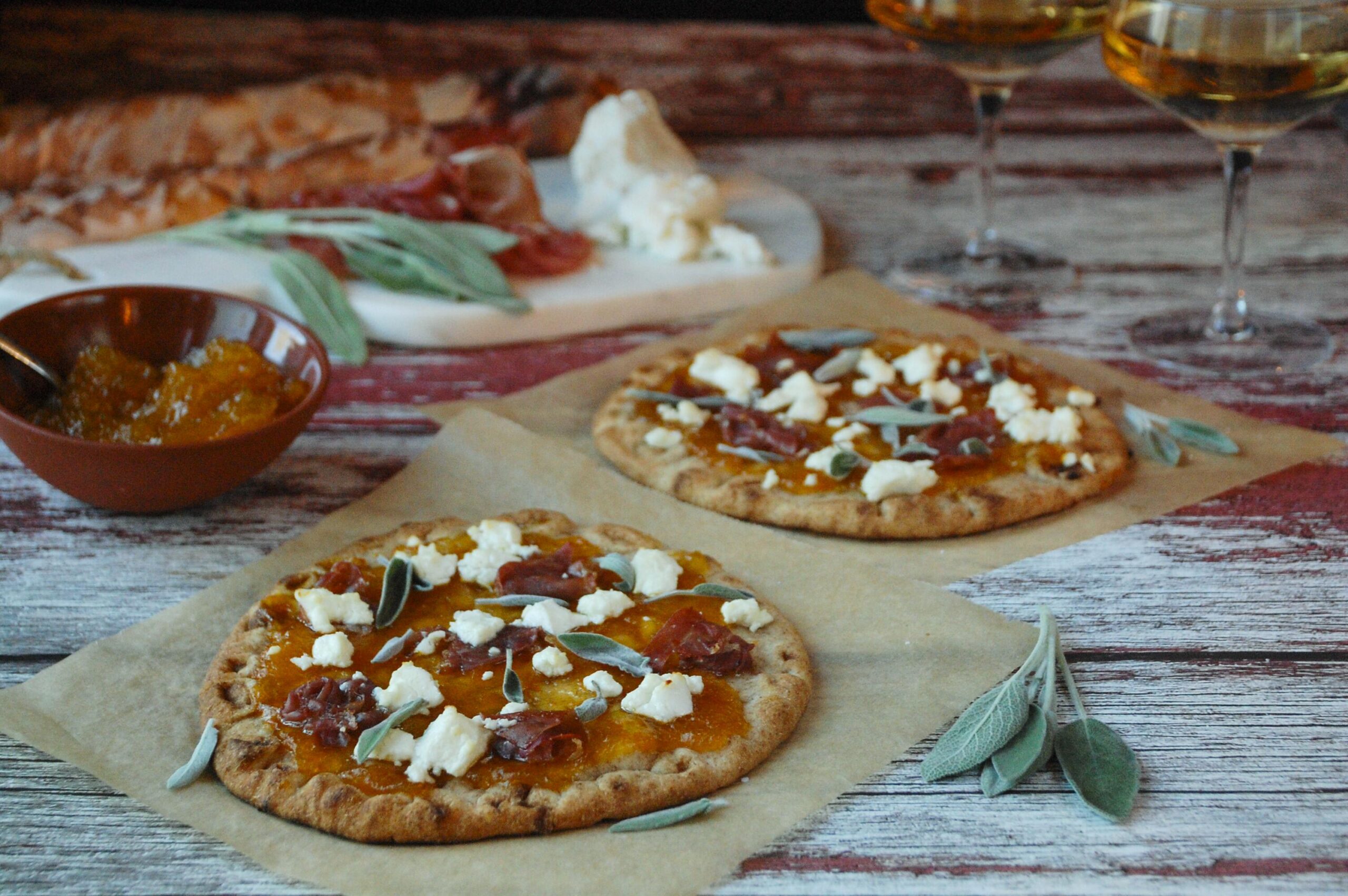Spread 2 tablespoons Skinnygirl Preserves over each flatbread then sprinkle with goat cheese and prosciutto.
